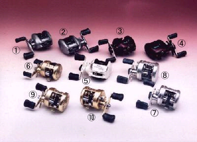 Eカルカッタ 50XT、Fカルカッタ 100、Gカルカッタ 200、Hカルカッタ 100XT、Iカルカッタ 101XT(左)・・・カルカッタは世界のベイトリ−ルの方向性を一変してしまったシマノの技術の結晶体です。ハンドルのあそびのないス−パ−ストッパ−、ワンタッチでブレ−キ力を調節できるSVSなど、抜群の使い心地です。超軽量ルア−(3.5g)のキャストを容易にする超小型50XTはスピニングタックルでないと扱えないようなライトリグをキャスティングできます。